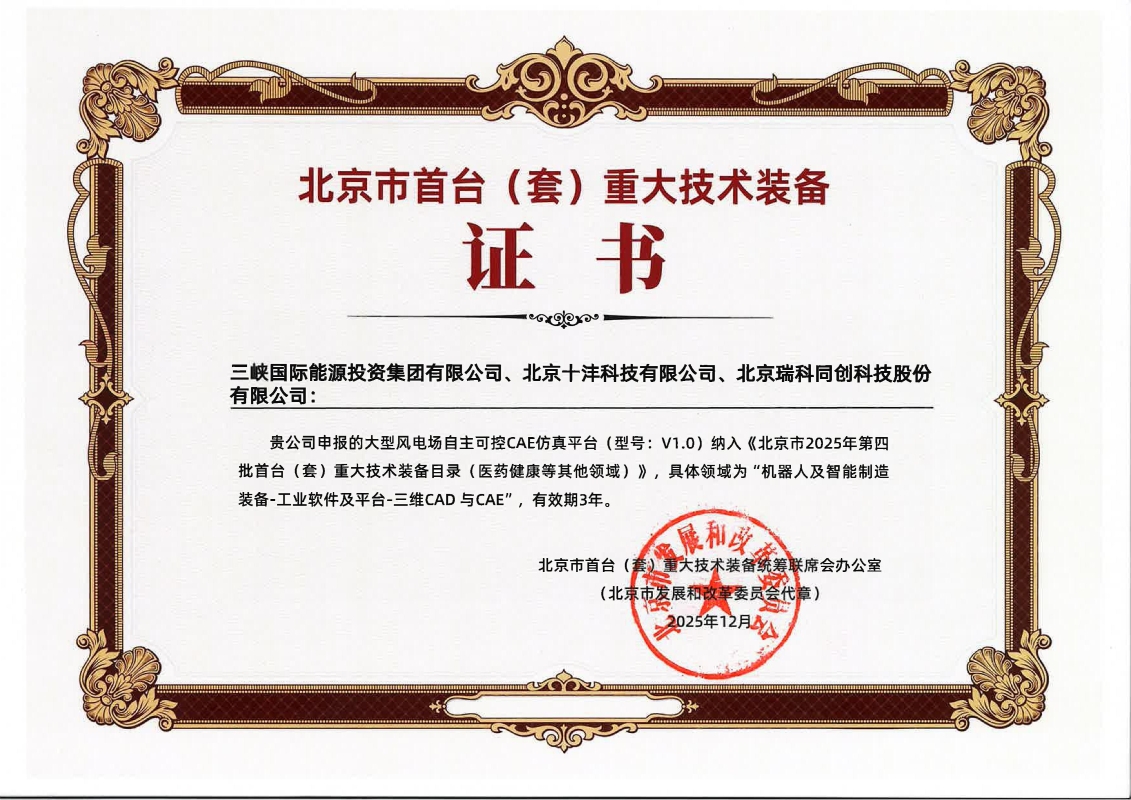 此次獲批的北京市首臺(套)重大技術裝備由公司創新業務發展與研究中心負責牽頭研發,參加單位包括北京十灃科技有限公司和北京瑞科同創科技股份有限公司。該平臺已應用在三峽亞非公司約旦沙巴克風電場,為海外新能源項目提供高精度仿真與評估能力,是我國風電領域自主研發與裝備國際化應用的重要實踐。